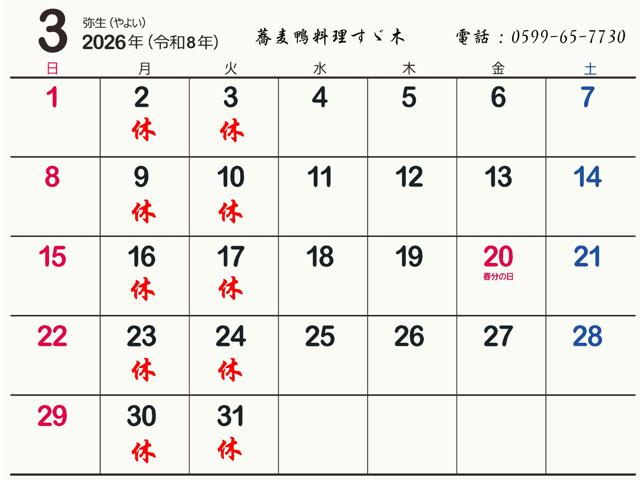 2026年3月の営業日と休業日のお知らせ 投稿日: 2026年2月19日 投稿者: wpmaster 3月の営業日をご案内いたします。 春の訪れを感じる季節となりました。今月も皆さまのご来店を心よりお待ちしております。 定休日をご確認のうえ、ご来店ください。どうぞよろしくお願いいたします。 店主