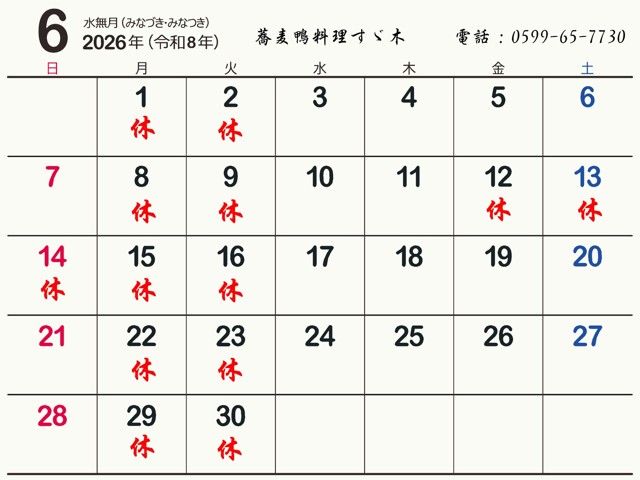 2026年6月の営業日と休業日のお知らせ 投稿日: 2026年4月21日2026年4月21日 投稿者: wpmaster 2026年6月の営業日と休業日のお知らせ 若葉が目に鮮やかに映る頃となりました。まだ4月ではございますが、6月の営業日をご案内いたします。ご予約・ご来店の際のご参考にしていただけましたら幸いです。皆様のお越しを、スタッフ一同心よりお待ち申し上げております。 店主